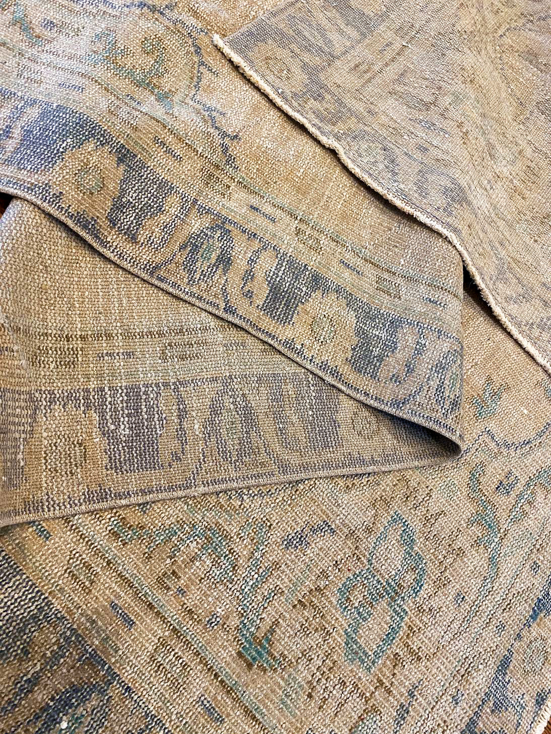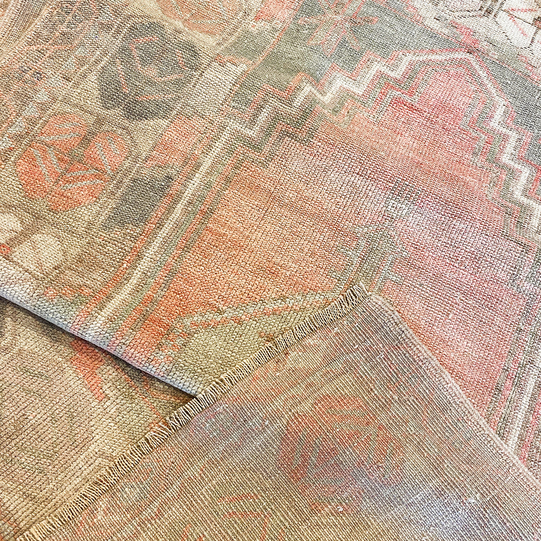 Some vintage rugs have visible tie-offs that look like white dots. They are part of the handmade process and occur where weavers tie off strings from the warp that can break during hand-weaving. They do not compromise the integrity of the rug.